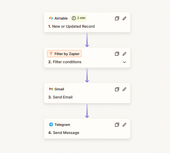 (4) Send Telegram Message – Push instant alerts to a Telegram group for real-time updates on important records.